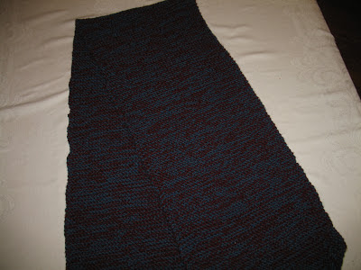 The first is a scarf in four shades of blue: blue, wedgewood, aqua, light blue. I used 25% wool / 75% acrylic yarn in 143-yard skeins (100 grams, or 3-1/2 ounces, per skein) -- 2 skeins each of wedgewood, aqua, and light blue, and 3 skeins of blue. I used the knit stitch with double strands of yarn all the way through, with size 17 needles, getting 3 stitches and 2-1/2 rows to an inch. Each blue-shade block has 18 stitches per row and 12 rows. There are 9 blocks in all, 2 each of wedgewood, aqua, and light blue, and 3 of blue.